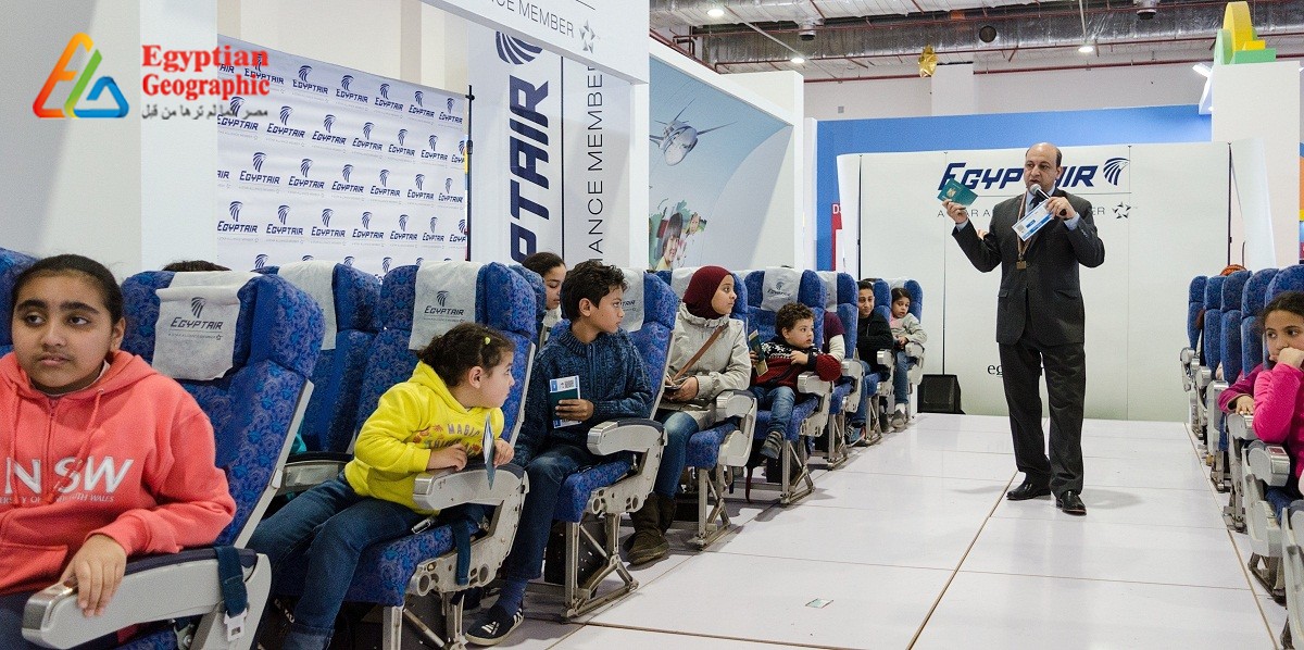 "مرحبًا بكم علي متن طائرة مصر للطيران رقم (.......) والمتجهة بكم إلي (......) نرجو من سيادتكم التأكد من ربط الأحزمة استعدادًا للإقلاع".. أسرع العشرات من الأطفال الجالسين علي مقاعد تلك الطائرة، والتي وضعت الشركة الوطنية مصر للطيران، نموذج لها داخل معرض القاهرة الدولي للكتاب، بربط الأحذمة