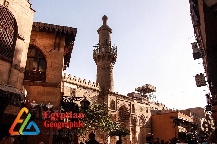 هنا القاهرة الفاطمية، حيث يتوسطها واحد من أجمل مساجد المحروسة، الجامع الأقمر في شارع النحاسين، والذي بناه الـوزيـر المـأمون بن البطايحى بأمر من الخليفة الآمر بأحكام الله أبى على منصور سنة 519هـ (1125 م) وهـو أول جامع في القاهرة تحتوي واجهته على تصميم هندسي خاصً. يروي المقريزي أن المسجد بنى في